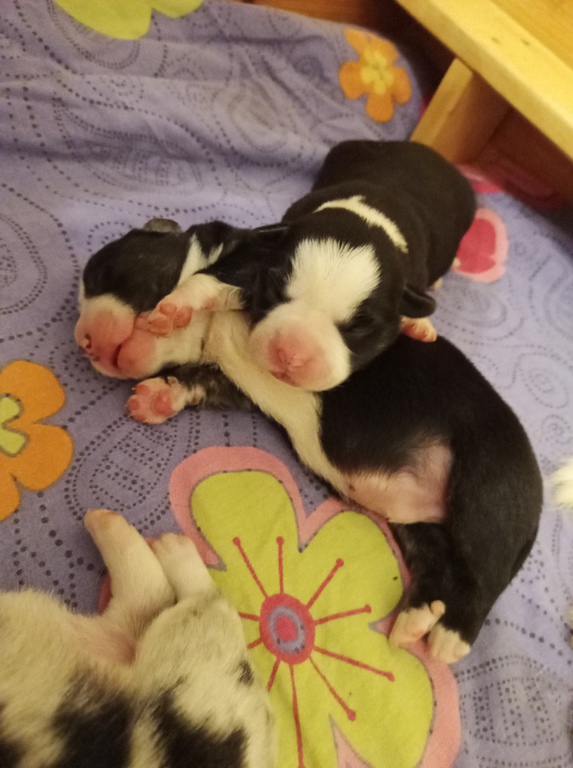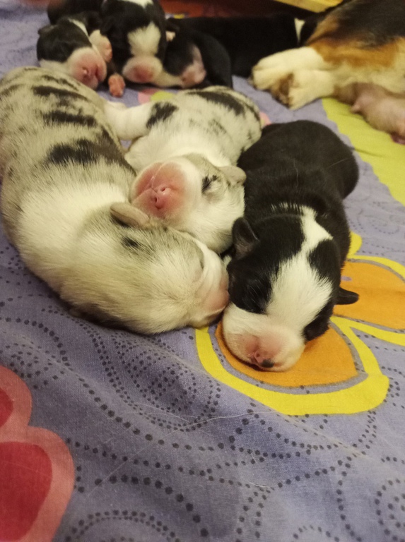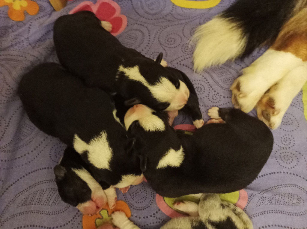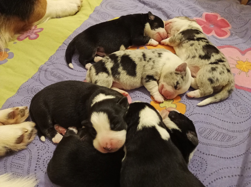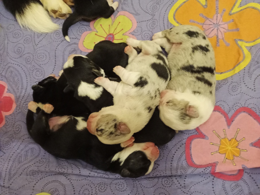 Es sind 4 Rüden, davon ein blue-merle und drei tricolor , und zwei Hündinnen, davon eine blue-merle und eine tricolor.