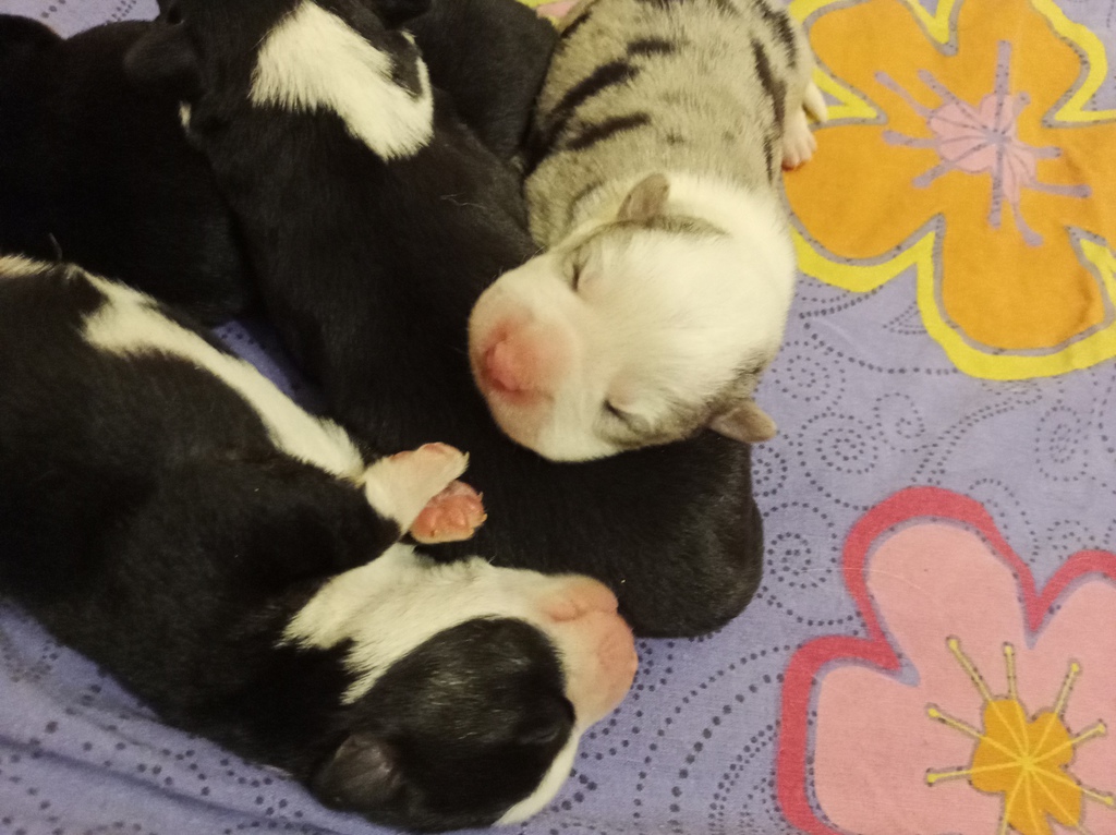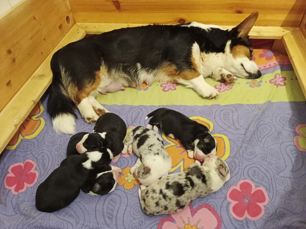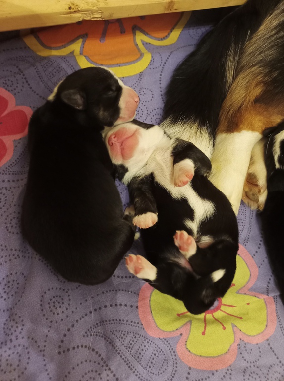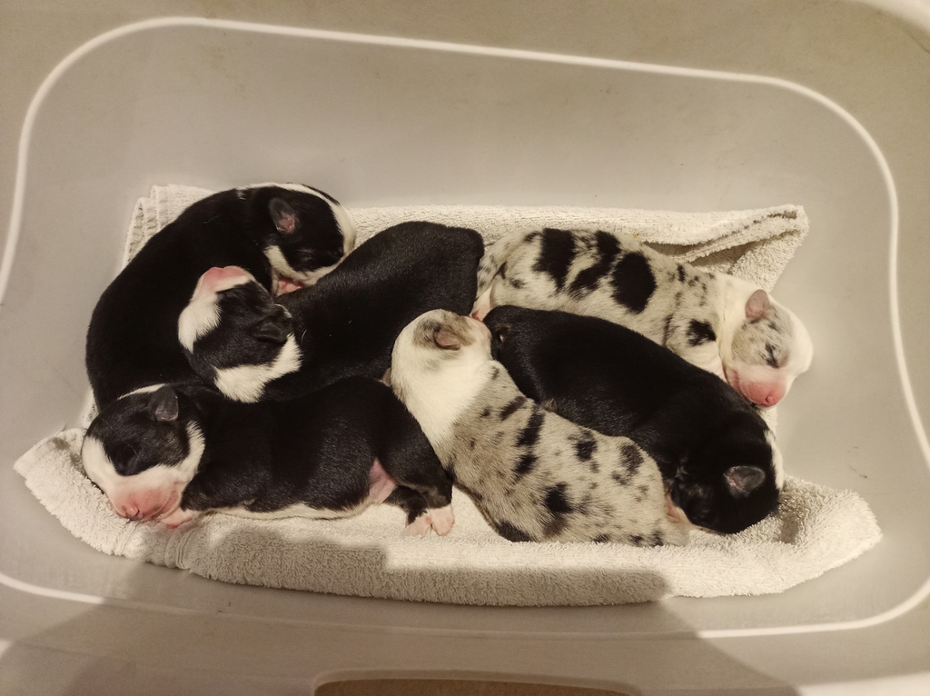 Nelly hat innerhalb von 4,5 Stunden ihre Welpen geboren, von 01.22 Uhr Nachts bis 06.17 Uhr morgens. Wenn man älter wird, feiert man nun nicht mehr die Nächste durch, man begleitet seine Hündin in der Geburt. :-).