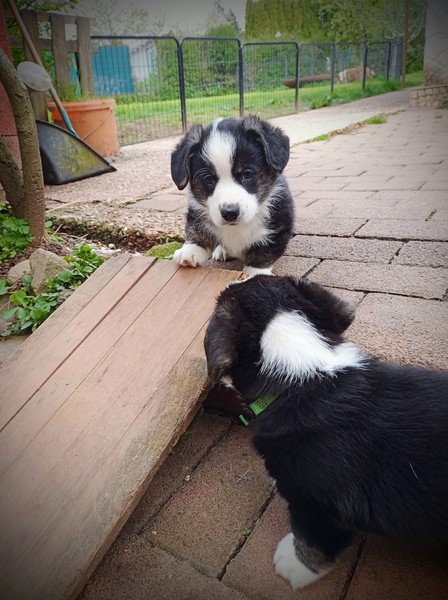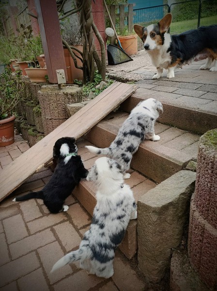 In der Woche vor Ostern waren sie das erste Mal mit den ''Großen'' draußen. Sie haben sich alle vorbildlich verhalten und es war sehr aufregend mit Uropa Noel, Tante Rosi, unserem Jungspund Jacky ( 7 Monate alt) und natürlich mit Mama, Papa und Oma Peach; im Garten zu tollen und zu spielen.